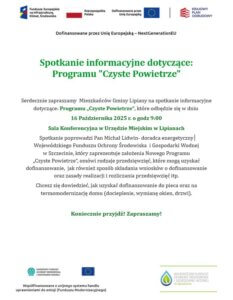Serdecznie zapraszamy  Mieszkańców Gminy Lipiany na spotkanie informacyjne dotyczące: Programu „Czyste Powietrze”, które odbędzie się w dniu  16 Października 2025 r. o godz.  9:00