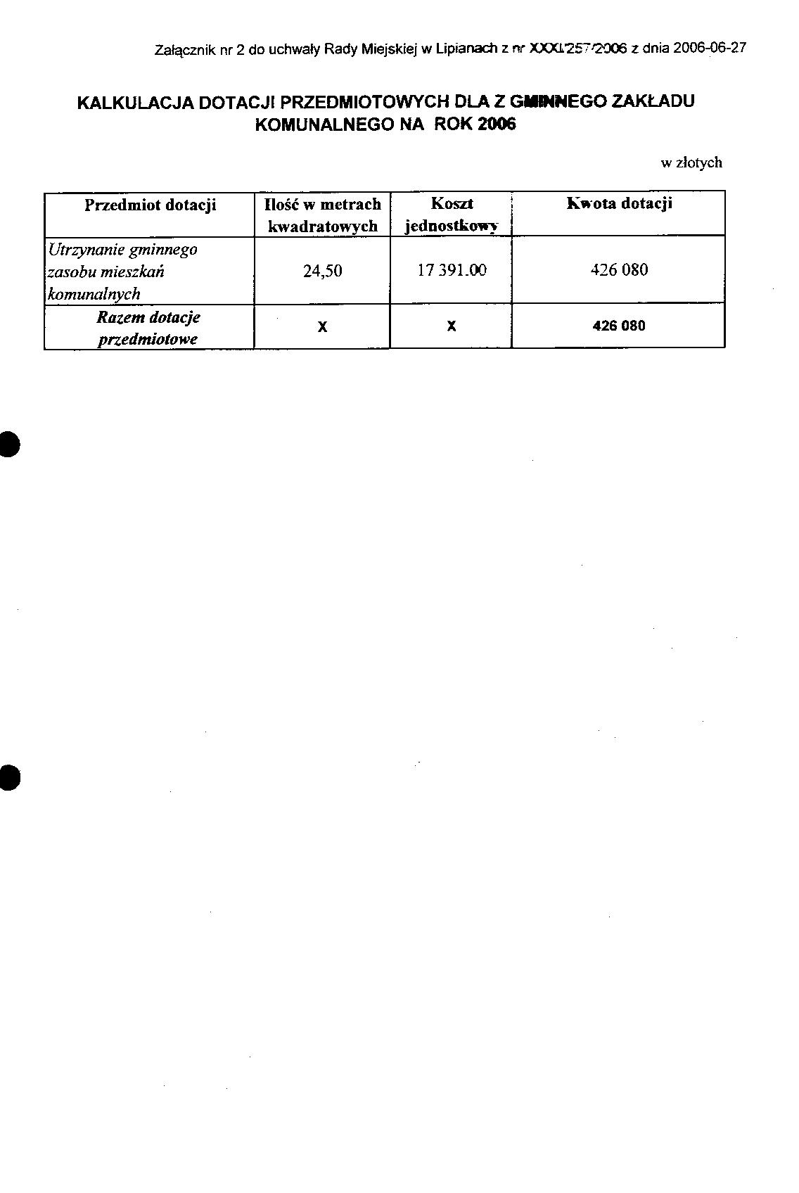 § 8. Ustala kalkulacje dotacji przedmiotowych dla Gminnego Zakładu Komunalnego zgodnie z załącznikiem nr 2 do uchwały, wysokość dotacji nie może przekraczać zrealizowanych dochodów z najmu lokali.