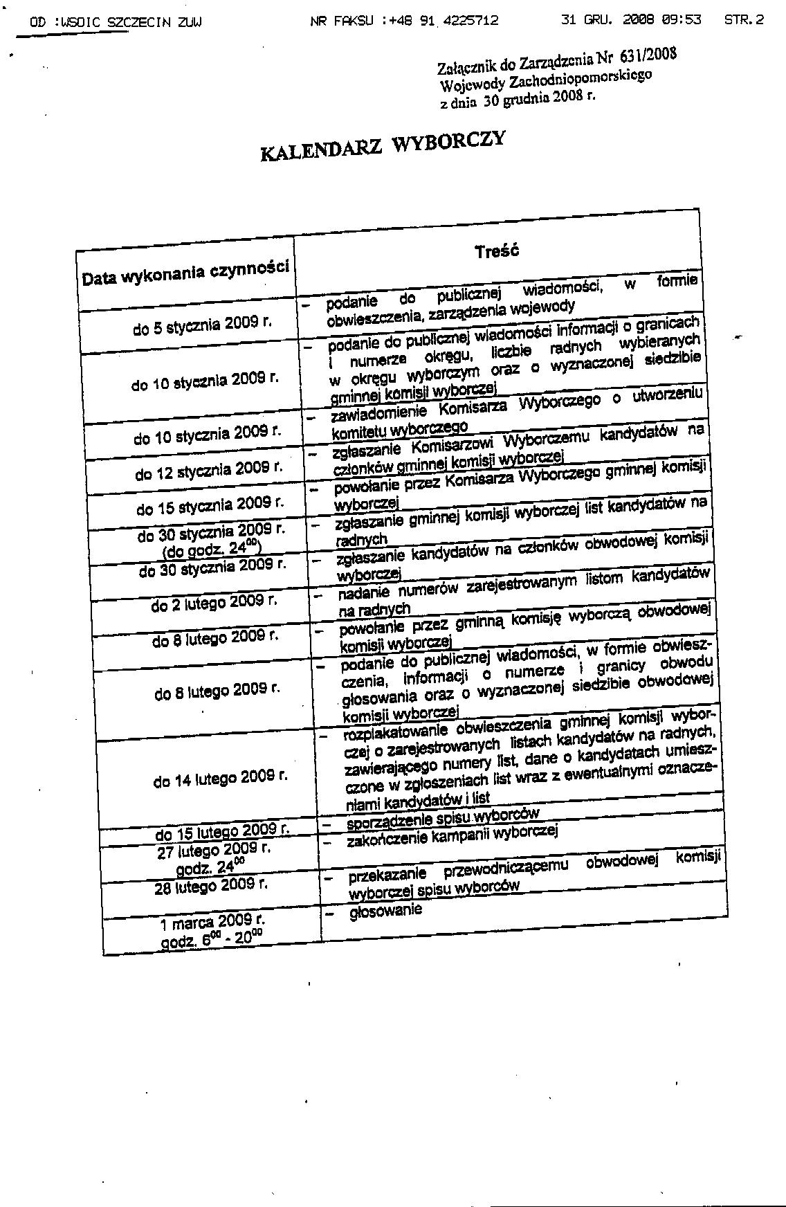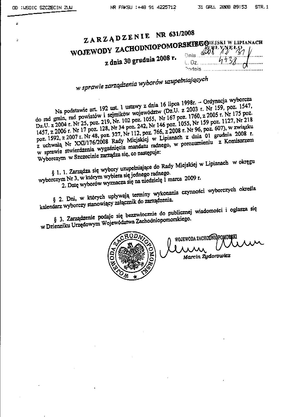 Zarządzenie Nr 631/2008 Wojewody Zachodniopomorskiego z dnia 30 grudnia 2008r. w sprawie zarządzenia wyborów uzupełniających