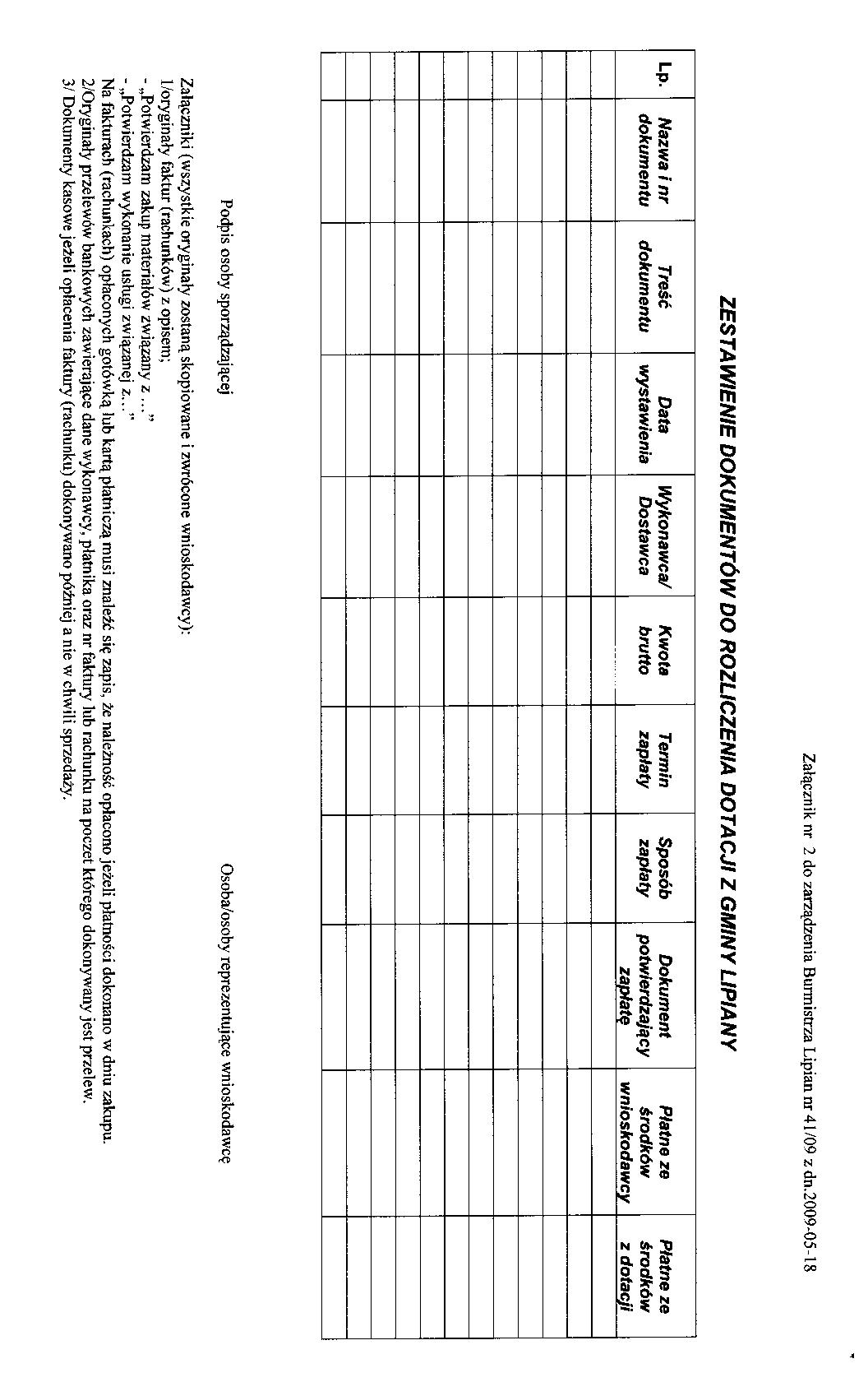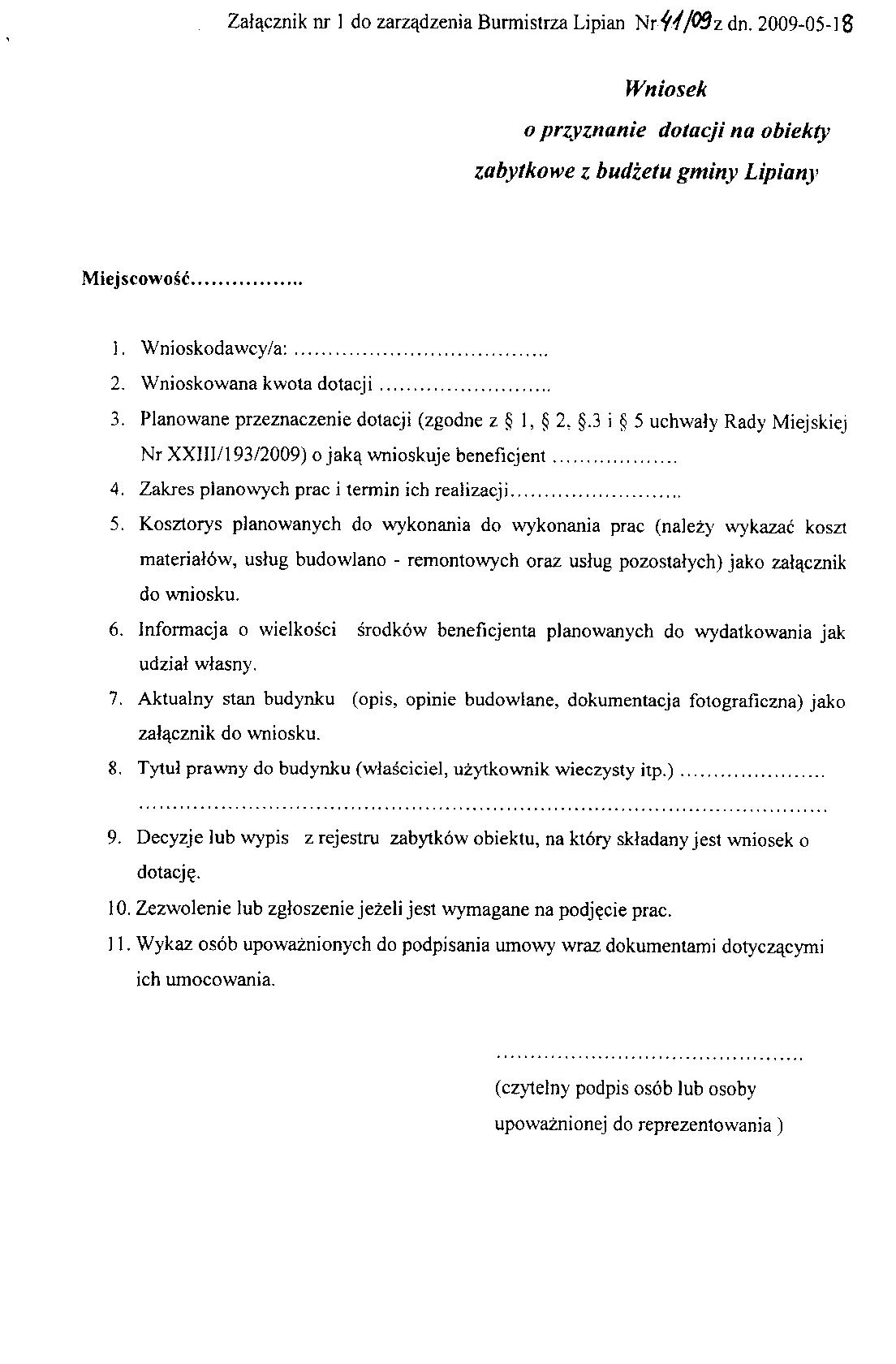 Zarządzenie Nr 41/2009 w sprawie ustalenia wniosku o udzielenie dotacji z budżetu gminy Lipiany