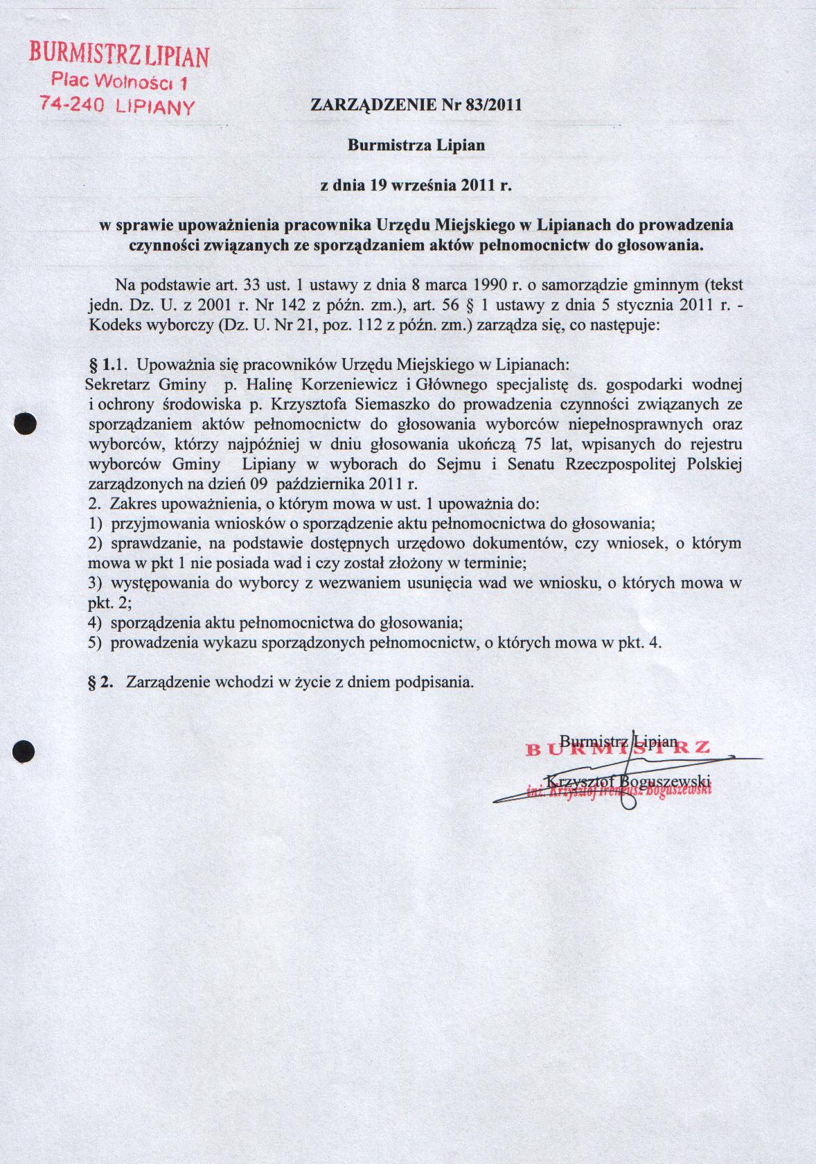 Zarządzenie Nr 83/2011 w sprawie upoważnienia pracownika Urzędu Miejskiego w Lipianach do prowadzenia czynności związanych ze sporządzaniem aktów pełnomocnictw do głosowania