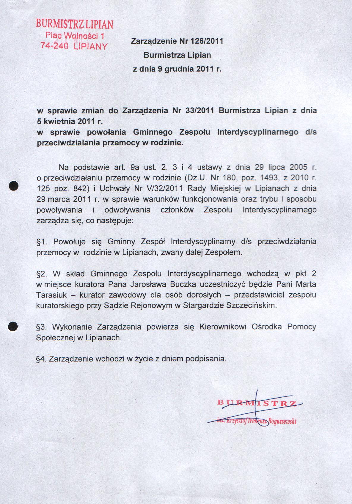 Zarządzenie Nr 126/2011 w sprawie zmian do Zarządzenia nr 33/2011 Burmistrza Lipian z dnia 5 kwietnia 2011r. w sprawie powołania Gminnego Zespołu Interdyscyplinarnego d/s przeciwdziałania przemocy w rodzinie