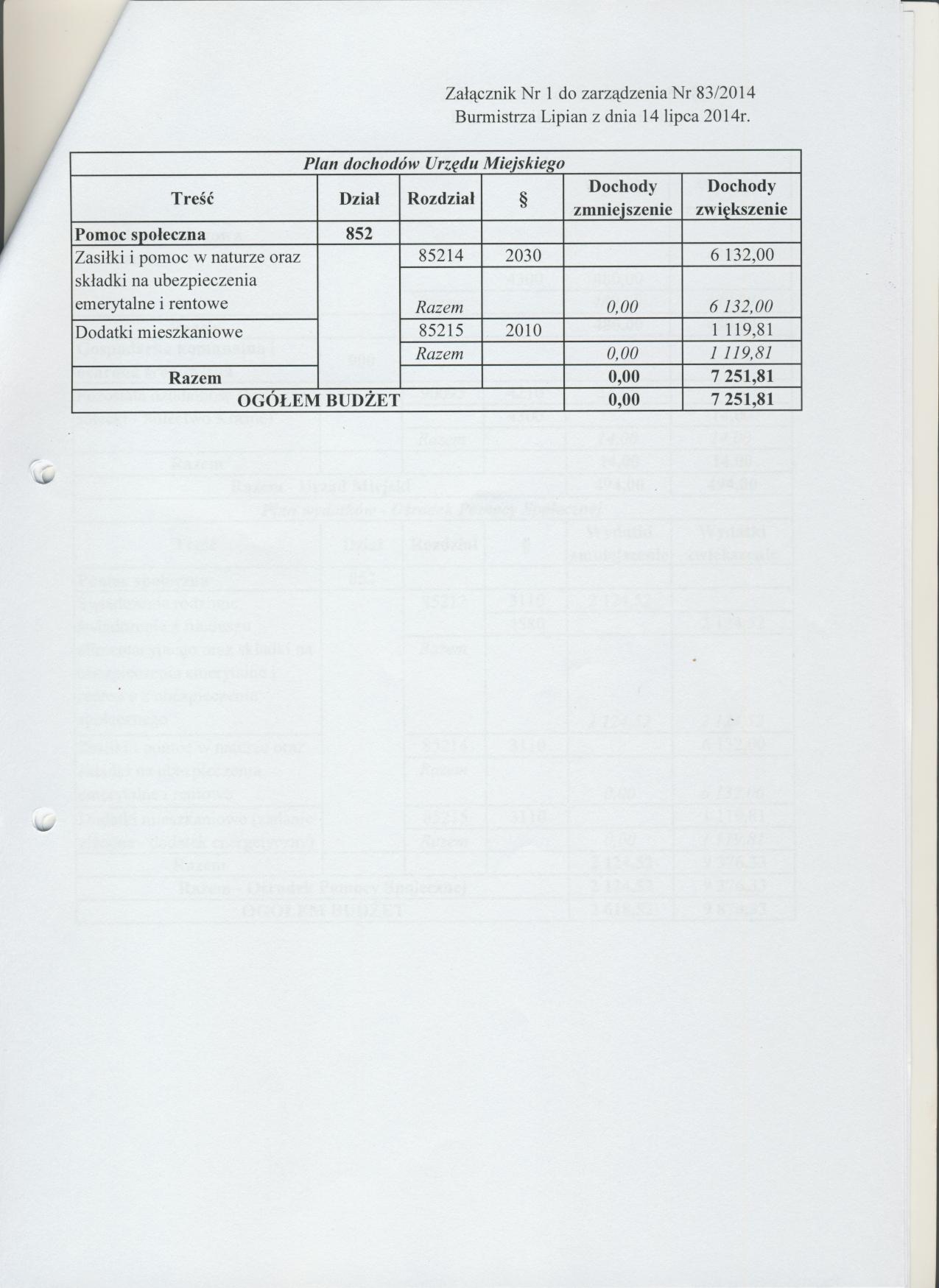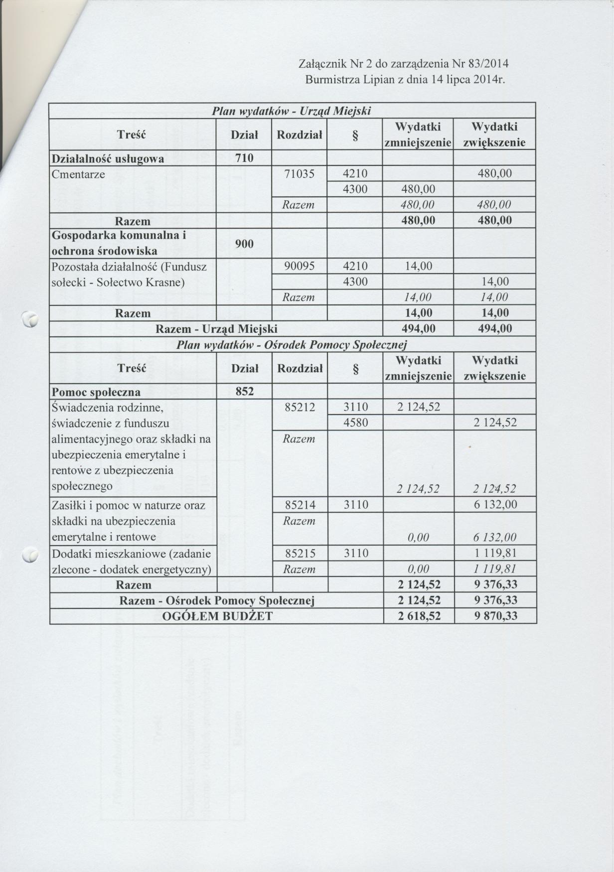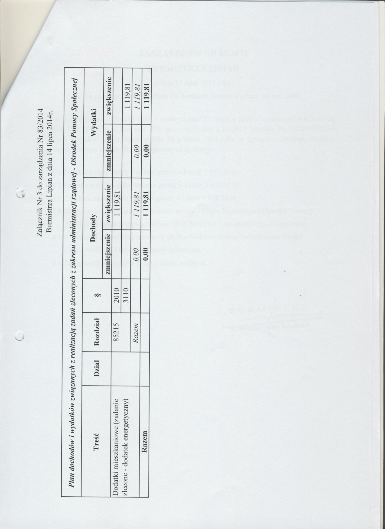 Zarządzenie Nr 83/2014 Burmistrza Lipian z dnia 14 lipca 2014 roku w sprawie zmian budżetu i w budżecie Gminy Lipiany na rok 2014