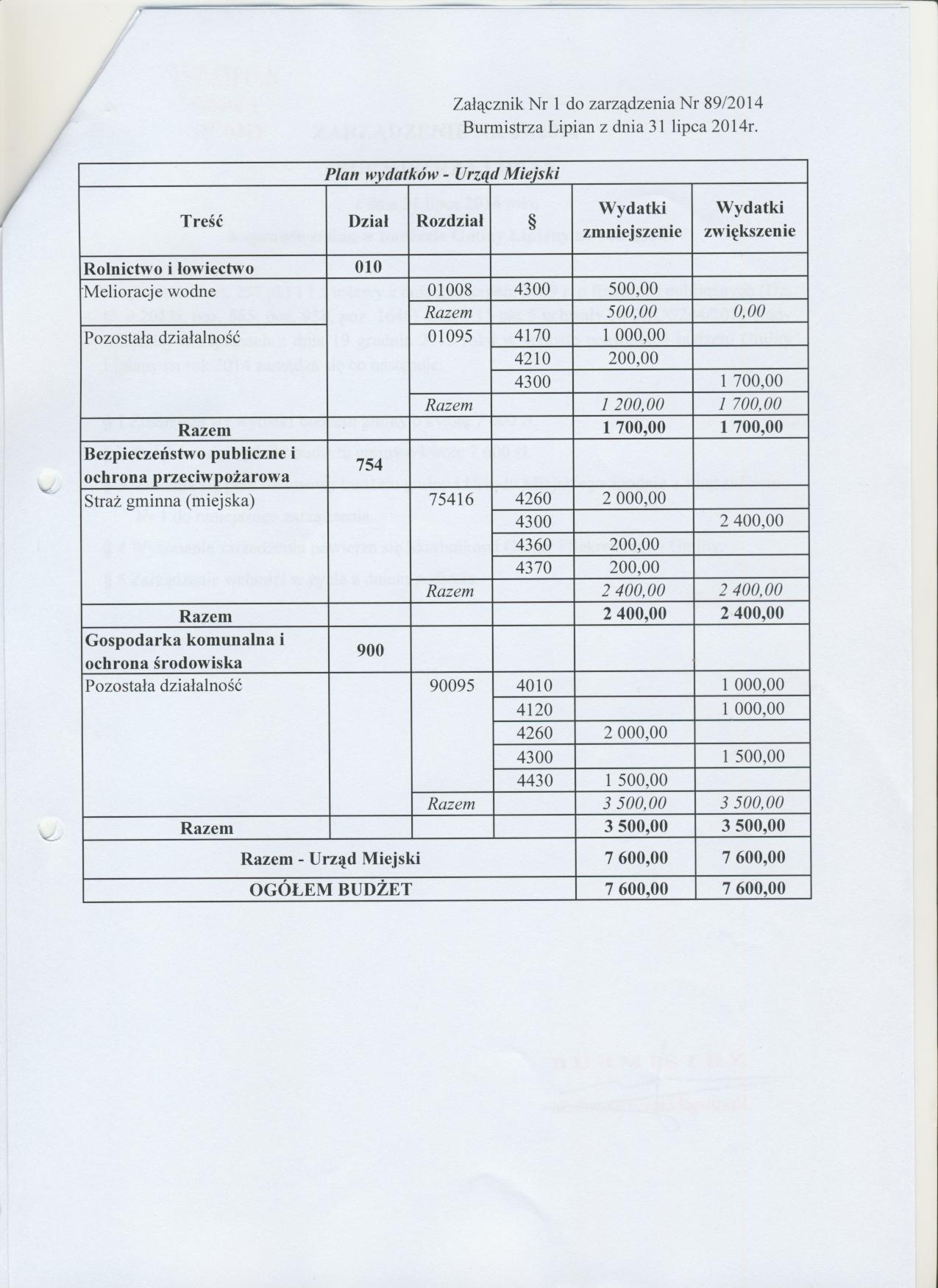 Zarządzenie Nr 89/2014 Burmistrza Lipian z dnia 31 lipca 2014r. w sprawie zmian w budżecie Gminy Lipiany na rok 2014