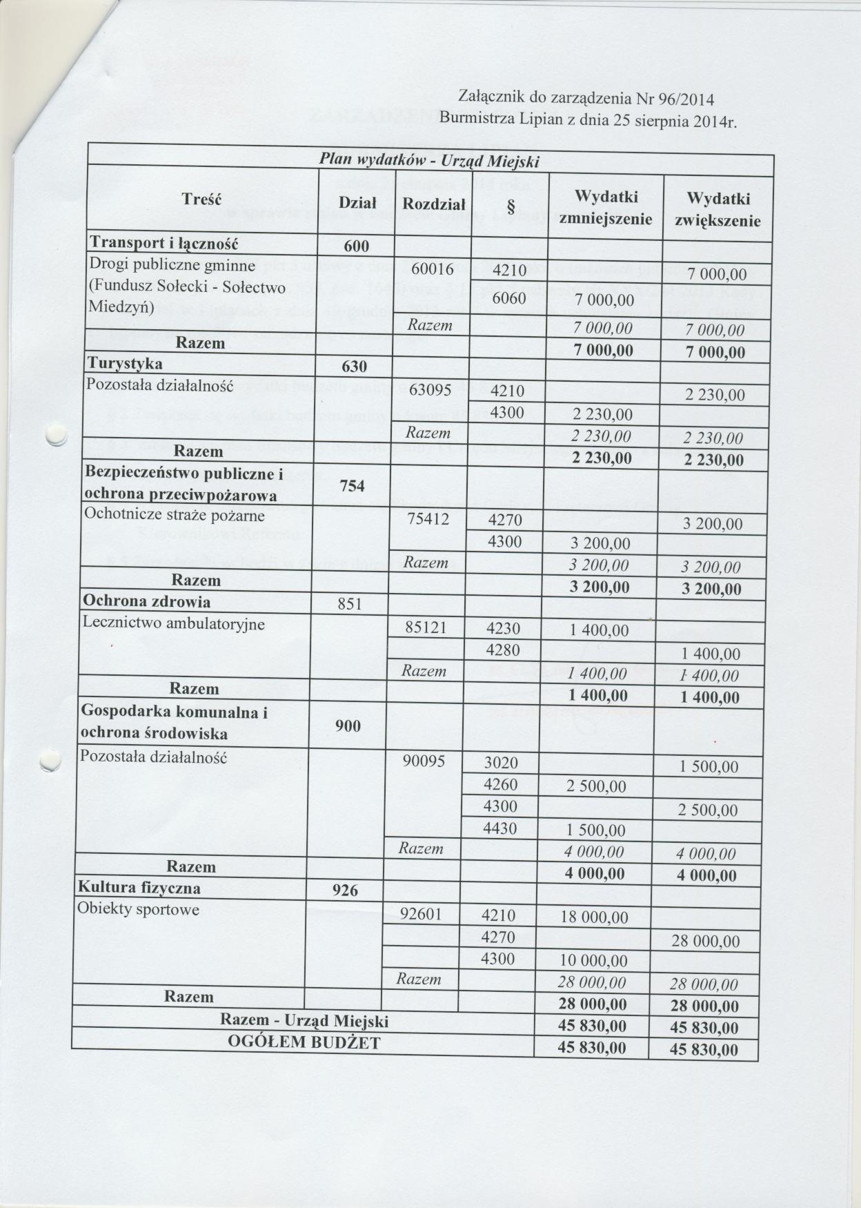 Zarządzenie Nr 96/2014 Burmistrza Lipian z dnia 25 sierpnia 2014 roku w sprawie zmian w budżecie Gminy Lipiany na rok 2014