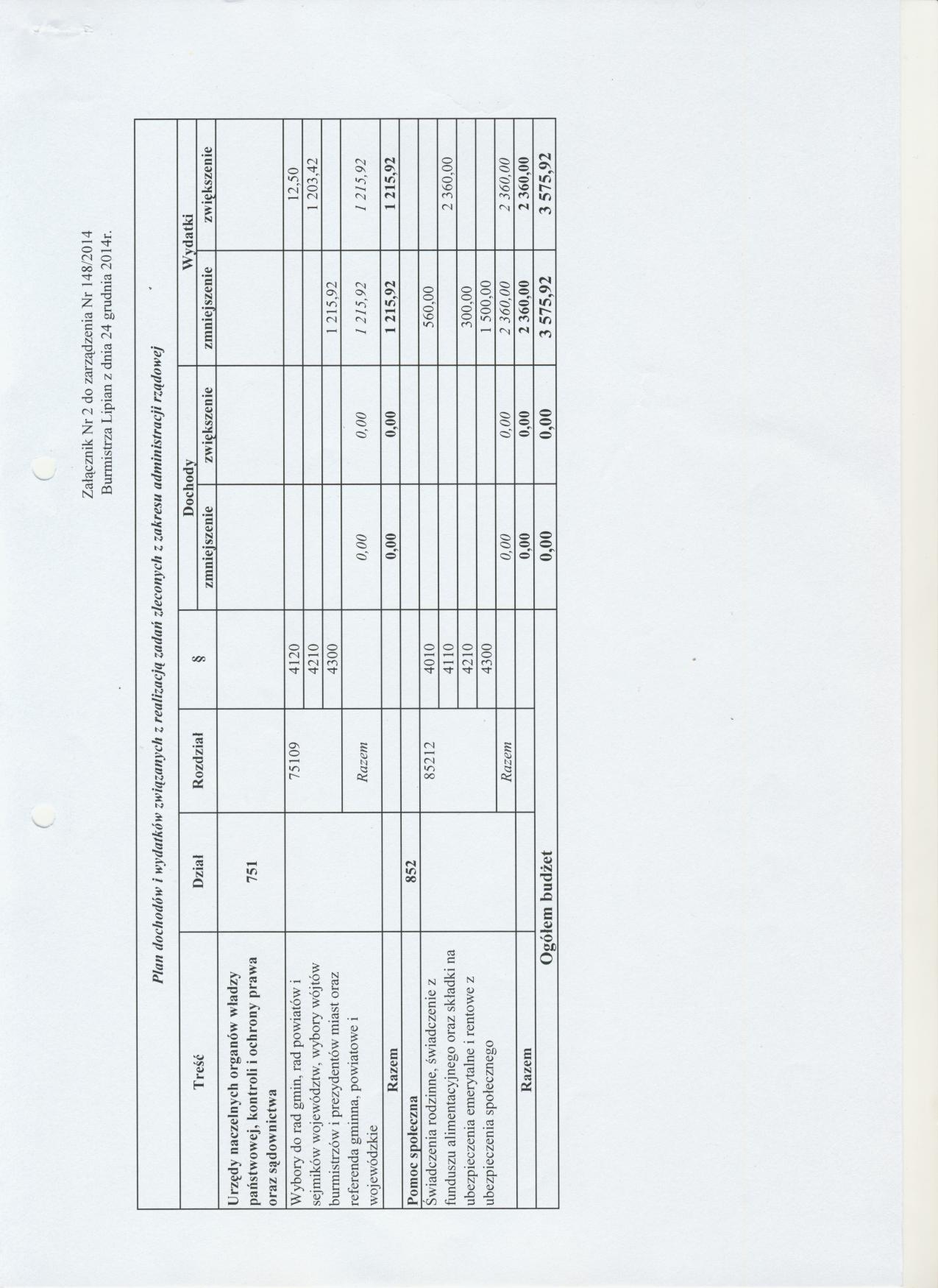 Zarządzenie Nr 148/2014 Burmistrza Lipian z dnia 24 grudnia 2014 roku w sprawie zmian w budżecie Gminy Lipiany na rok 2014