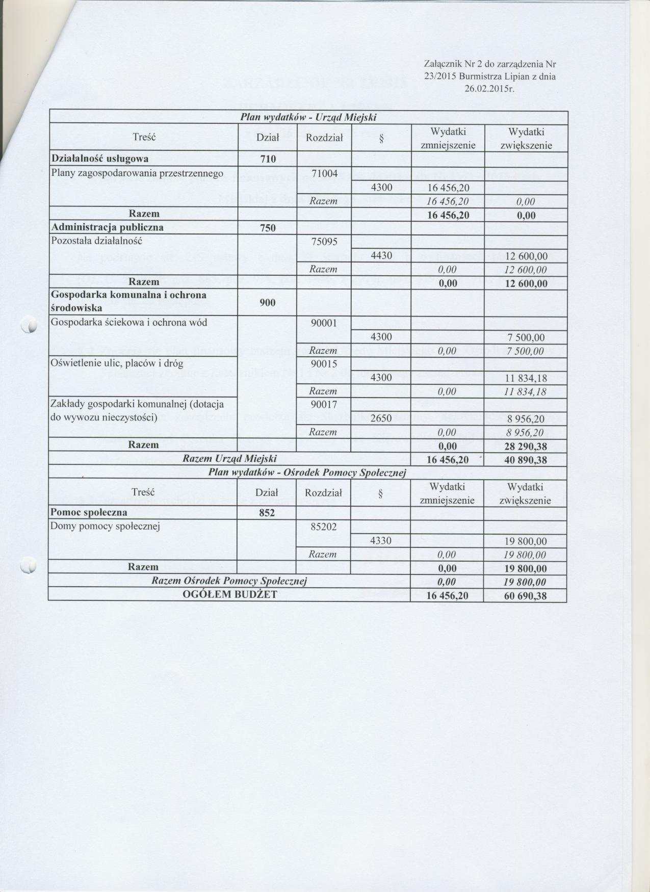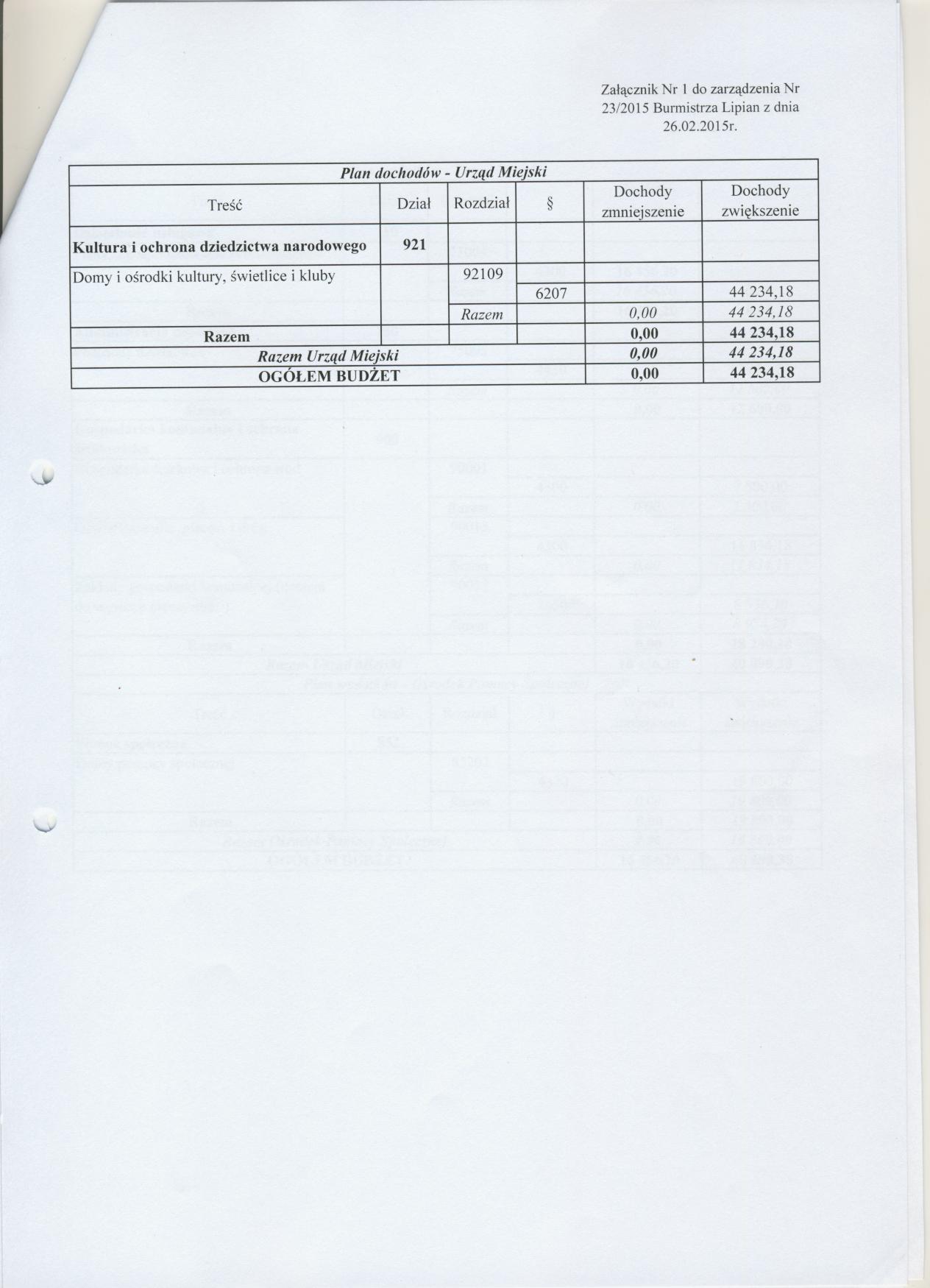 Zarządzenie Nr 23/2015 Burmistrza Lipian z dnia 26 lutego 2015 roku w sprawie zmiany planów finansowych na 2015 roku do uchwały Nr IV/17/2015 Rady Miejskiej z dnia 24 lutego 2015 roku