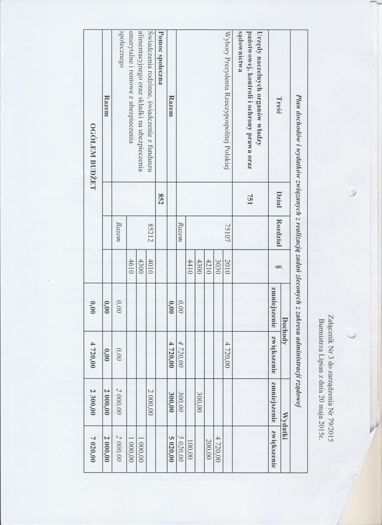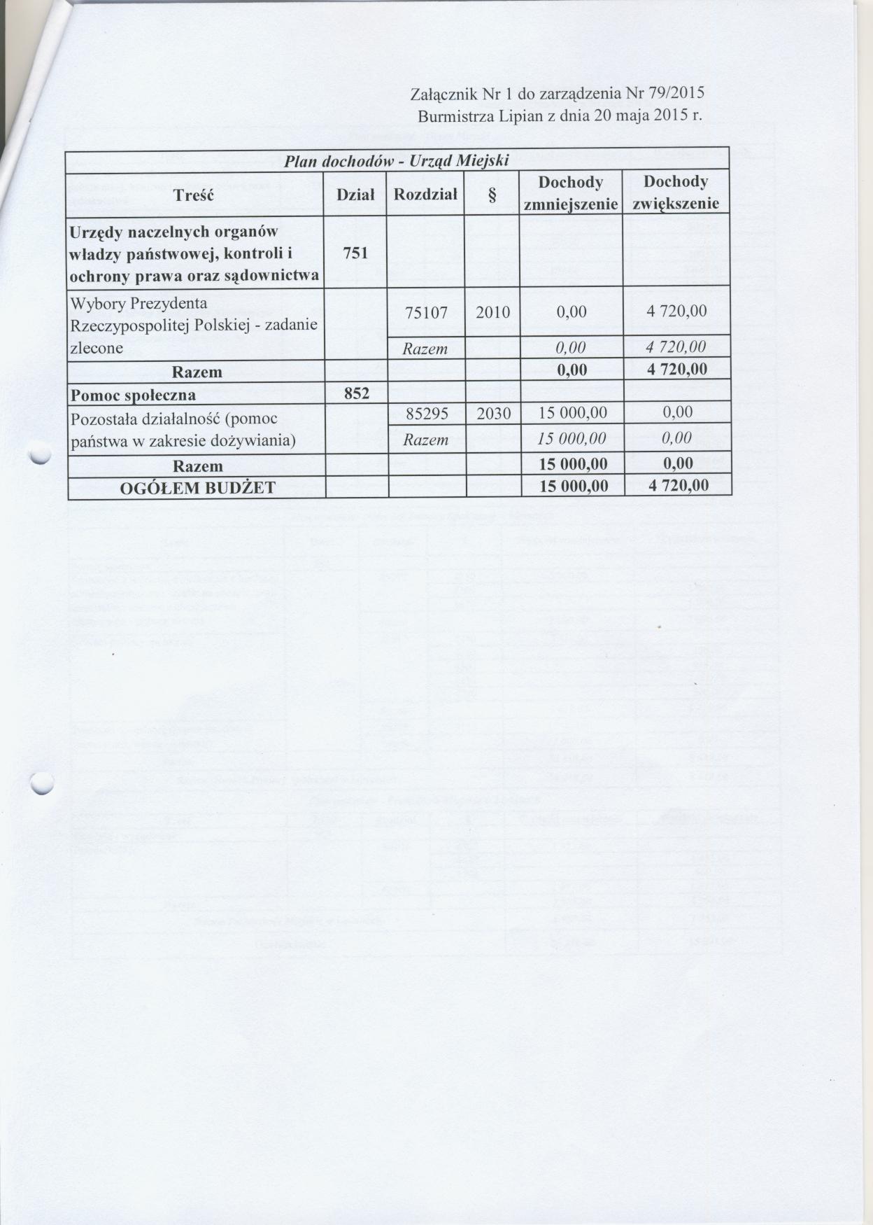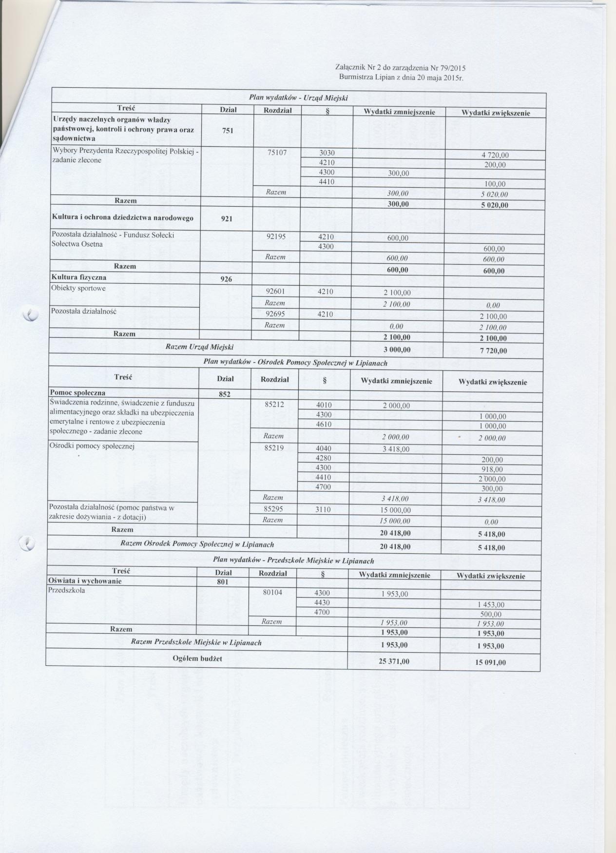 Zarządzenie Nr 79/2015 Burmistrza Lipian z dnia 20 maja 2015 roku w sprawie zmian budżetu i w budżecie Gminy Lipiany na rok 2015