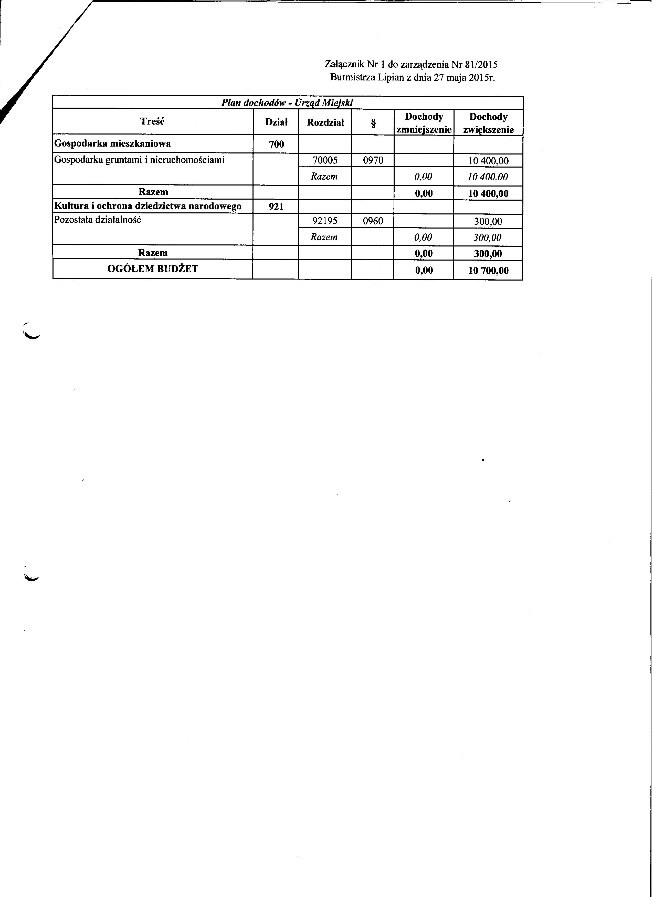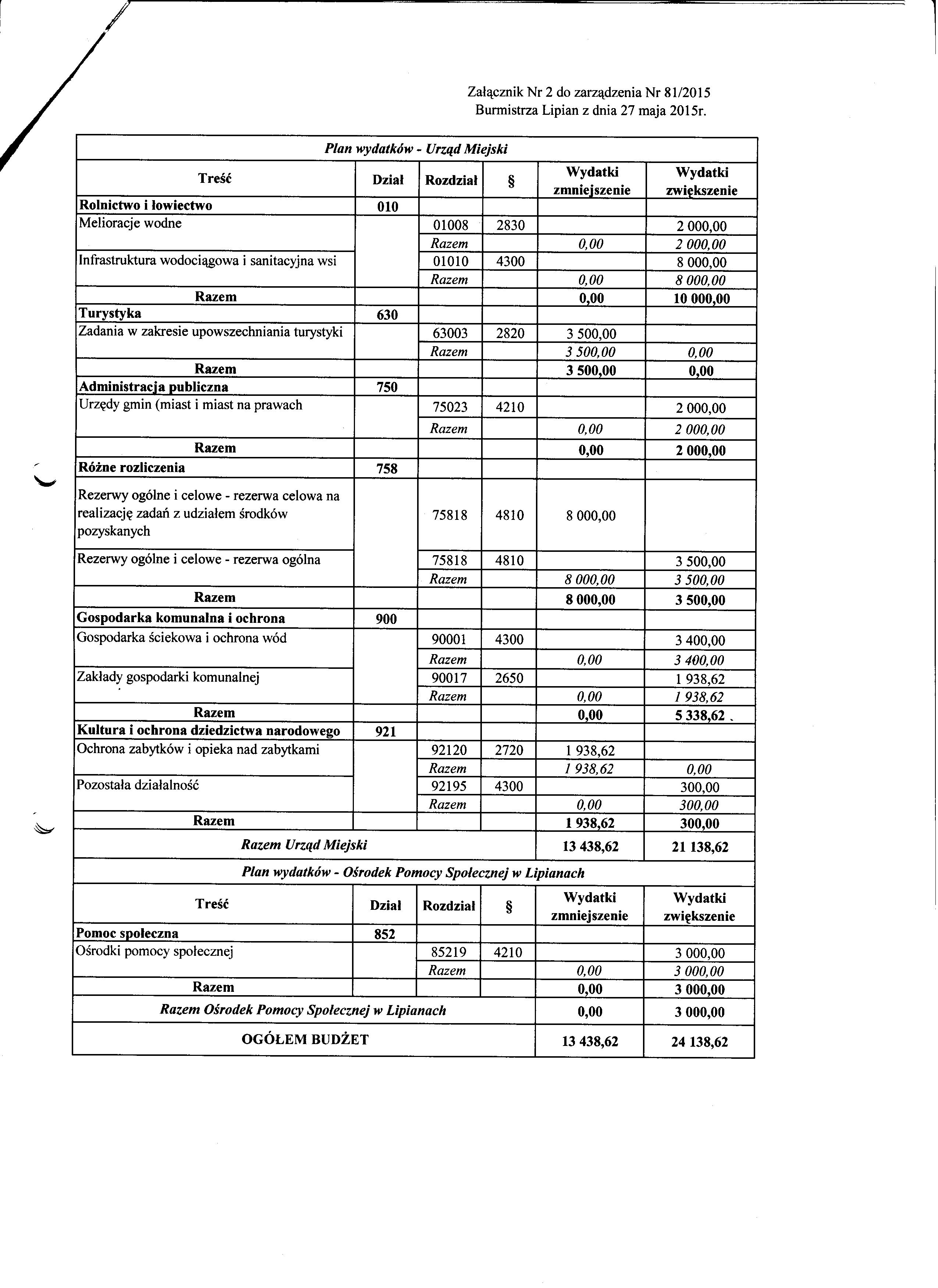 Zarządzenie Nr 81/2015 Burmistrza Lipian z dnia 27 maja 2015r. w sprawie planów finansowych na 2015 rok do uchwały Nr VI/35/2015 Rady Miejskiej w Lipianach z dnia 26 maja 2015r.