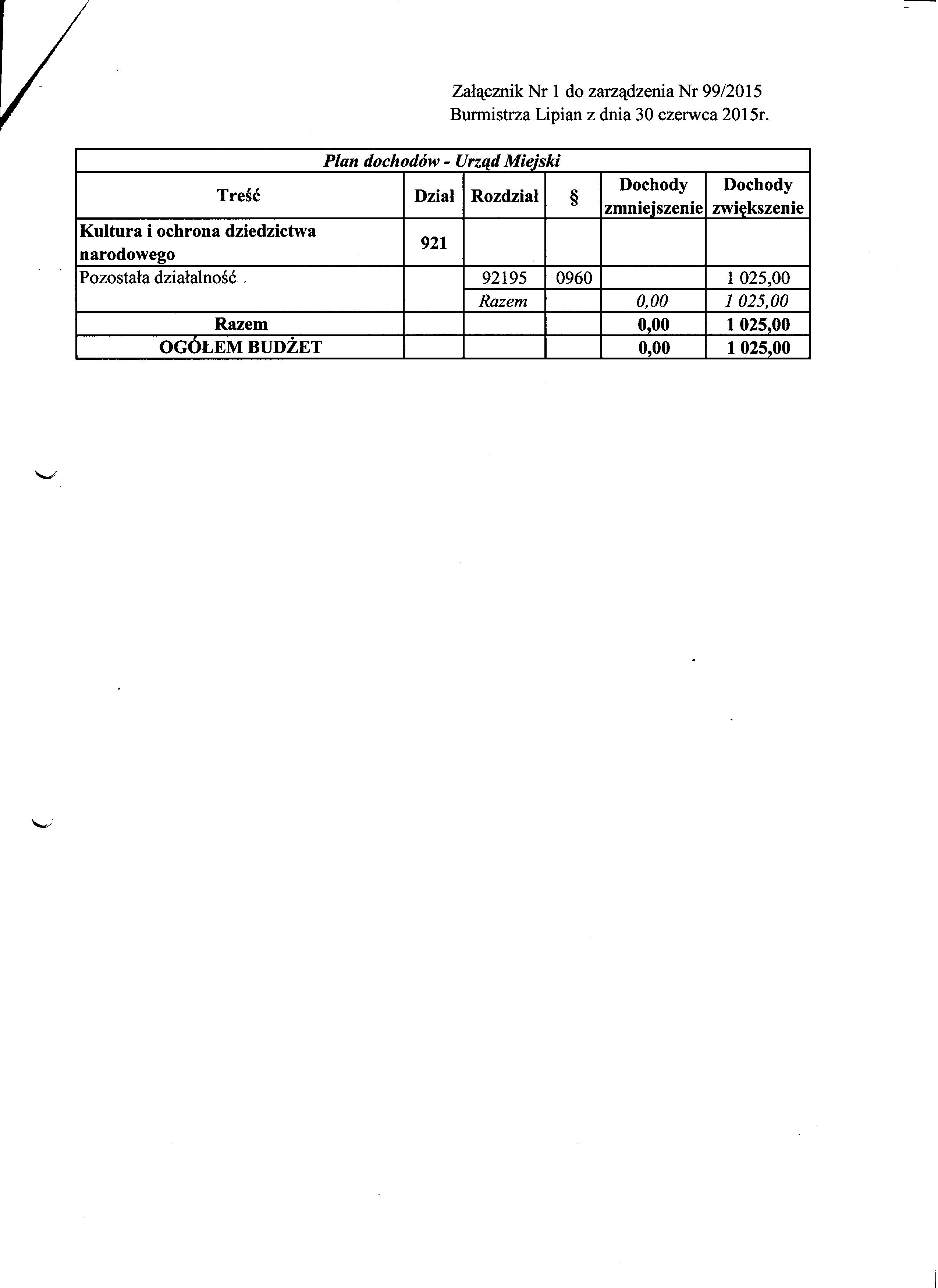 Zarządzenie Nr 99/2015 Burmistrza Lipian z dnia 30 czerwca 2015r. w sprawie zmiany planów finansowych na 2015 rok do uchwały Nr VII/46/2015 Rady Miejskiej w Lipianach z dnia 30 czerwca 2015r.