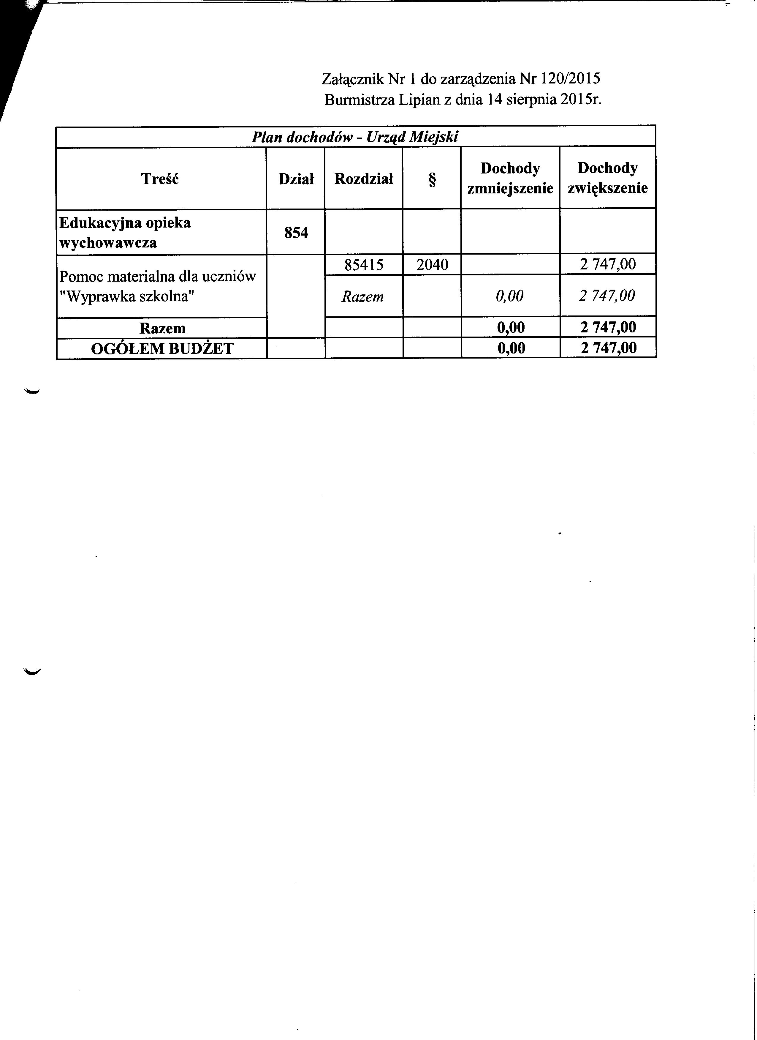 Zarządzenie Nr 120/2015 Burmistrza Lipian z dnia 14 sierpnia 2015 r. w sprawie zmian budżetu i w budżecie Gminy Lipiany na rok 2015